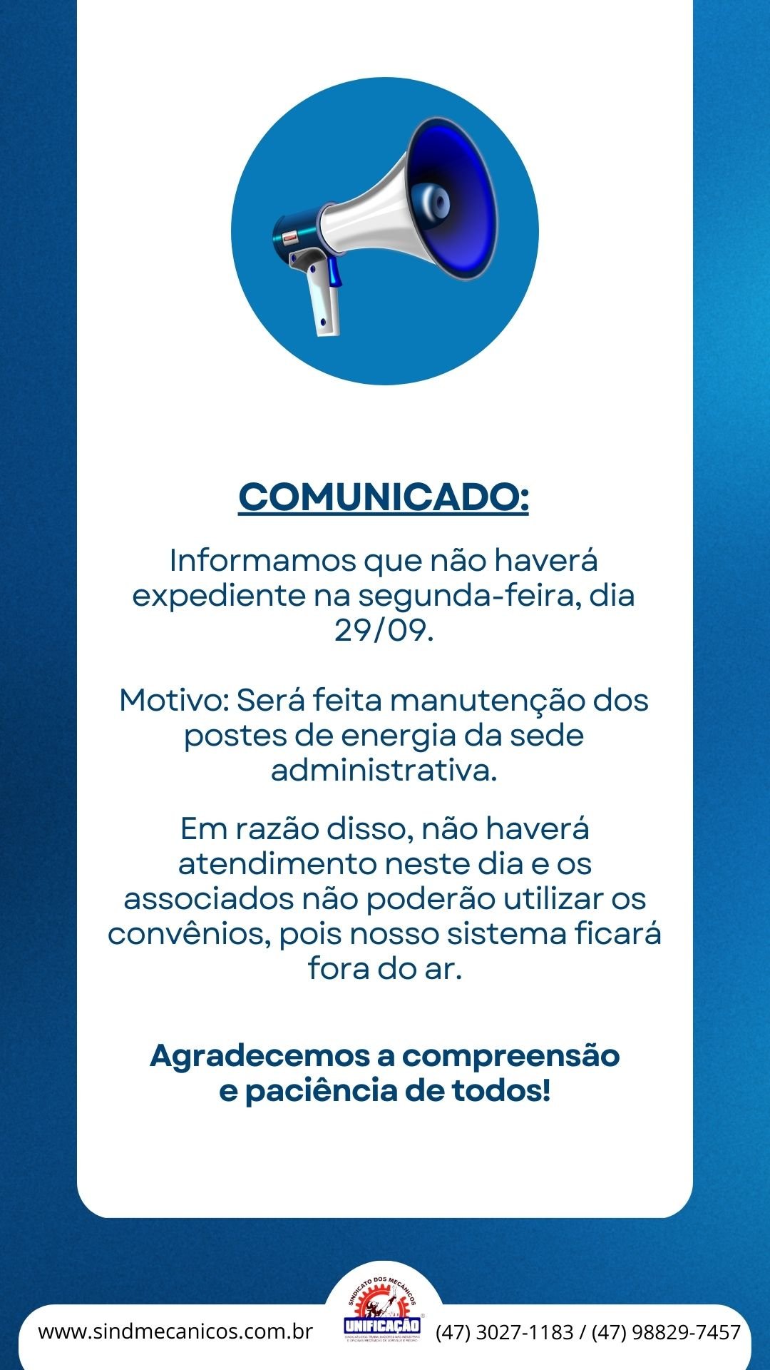 Comunicado – Dia 29/09 não haverá atendimento na sede